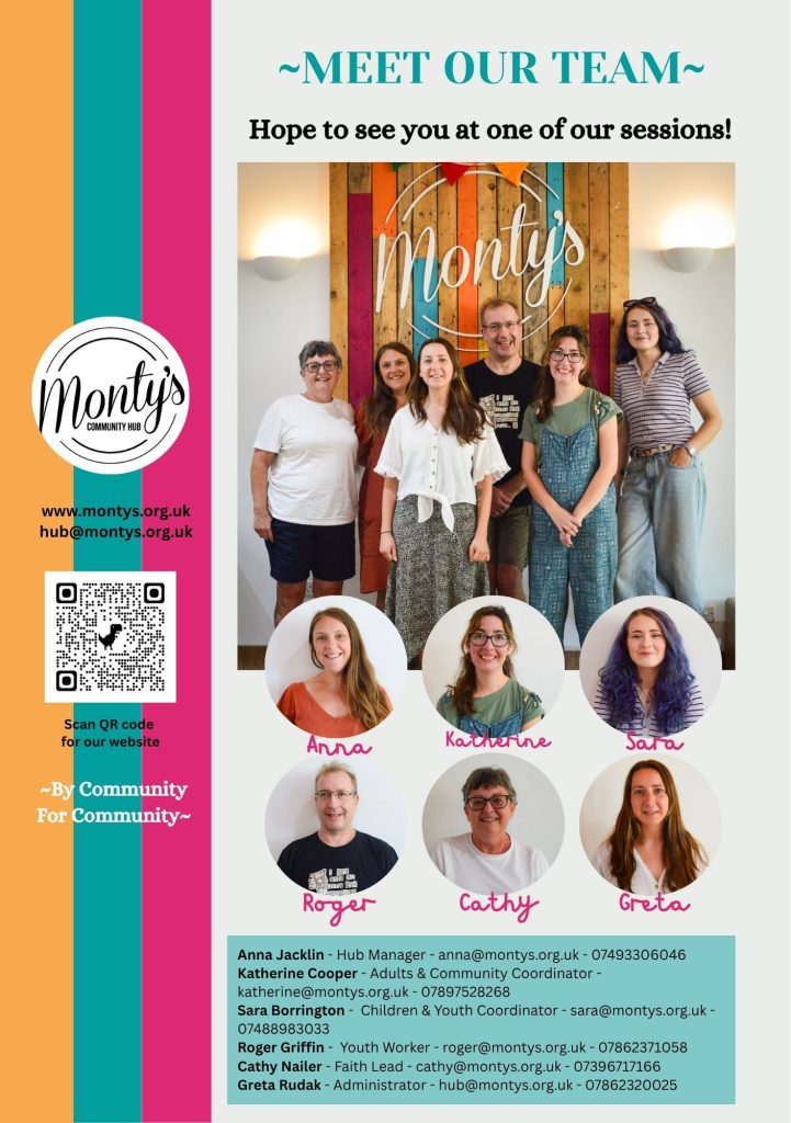 Monty’s is a collaborative community space, where local people offer their skills, time and energy to creatively address local needs and develop local solutions. Together we host groups and activities for children, young people, adults, and families – a place for the whole community to meet up, make friends, learn and share skills, support one another and share life.