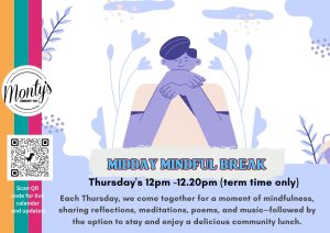 Each Thursday, we come together for a moment of mindfulness, sharing reflections, meditations, poems, and music—followed by the option to stay and enjoy a delicious community lunch. You can bring your own practice to share in the group.